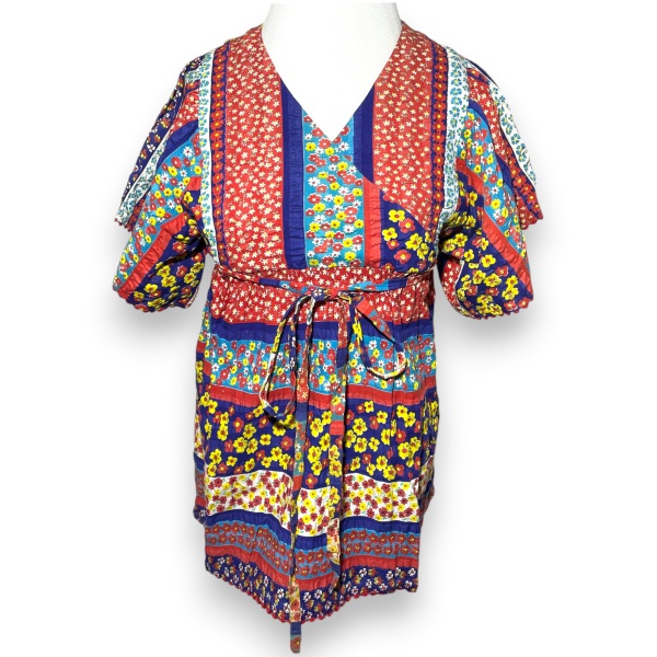• CONFECÇÕES RENEBE - BLUSA, DESIGN BOHO HIPPIE, CONFECCIONADA EM TECIDO MISTO COM PADRONAGEM FLORAL MULTICOLORIDA EM TONS DE AZUL, VERMELHO, AMARELO E BRANCO EM ESTILO PATCHWORK, DECOTE EM V, MANGAS CURTAS BUFANTES, CINTURA MARCADA POR FAIXA PARA AMARRAÇÃO, FECHAMENTO EM ZÍPER, TAMANHO 40. TRATA-SE DE PEÇA SEMINOVA, PODENDO APRESENTAR SINAIS DE USO, MARCAS DO TEMPO, DESGASTES NATURAIS, PEQUENAS IMPERFEIÇÕES, RESTAUROS, REPAROS E/OU OUTRAS CARACTERÍSTICAS PRÓPRIAS DE SUA NATUREZA, USO E ESTADO DE CONSERVAÇÃO, NÃO SENDO TAIS ASPECTOS, POR SI SÓ, MOTIVO PARA DESCLASSIFICAÇÃO, CANCELAMENTO OU QUESTIONAMENTOS POSTERIORES, DEVENDO O ARREMATANTE CONSIDERAR TAIS CONDIÇÕES PREVIAMENTE À OFERTA E ARREMATAÇÃO.