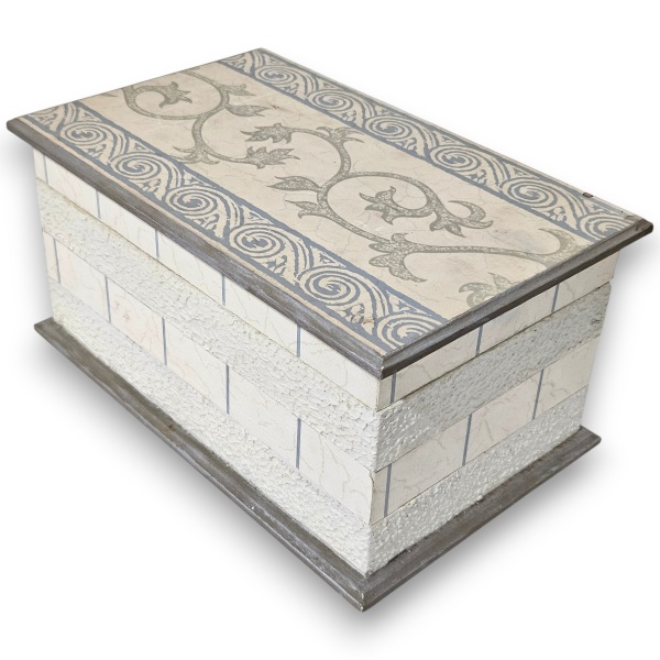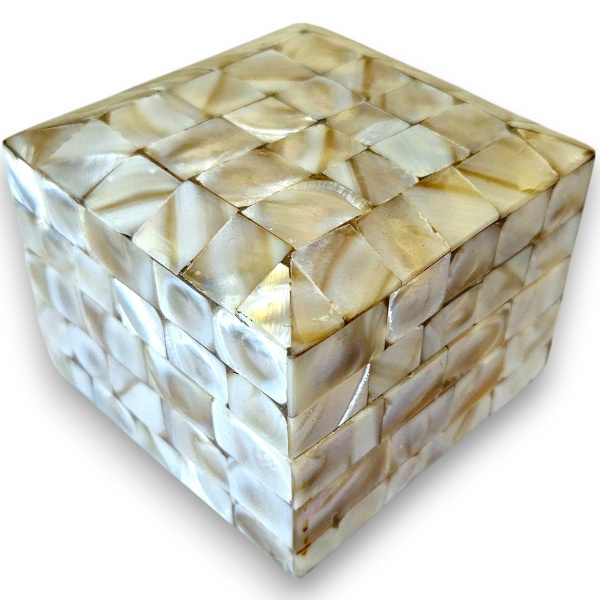• ELEGANTE PORTA OBJETOS, MADE IN INDIA, EXECUTADA EM MADEIRA COM DECORAÇÃO DE MOSAICO DE PLACAS DE ARTE EM MADREPÉROLA, MEDINDO 6 X 8 CM.