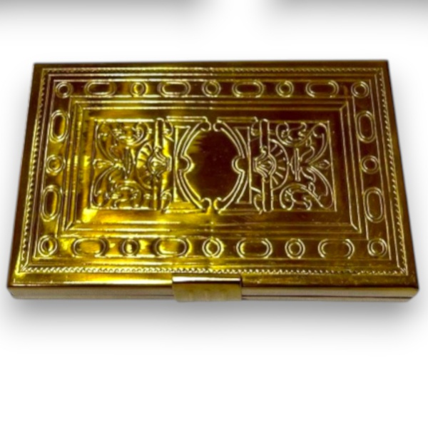 • ENCANTADORA CAIXA PARA MAQUIAGENS, EXECUTADA EM METAL DOURADO RICAMENTE ORNADA POR ESPELHO PARA MAQUIAGEM, MEDINDO 13 X 8 CM.